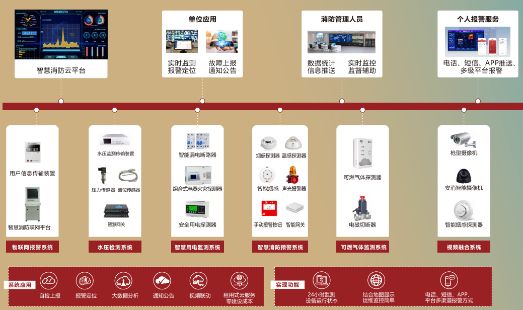 运用物联网、大数据等技术手段,将消防设施、社会化消防监督管理、灭火救援等各项要求,通过物联网信息传感与通讯等技术有机链接,实现实时、动态、互动、融合的消防信息采集、传递和处理,全面促进与提高消防监督与管理水平,增强灭火救援的指挥、调度、决策和处理能力,提升消防管理智能化、社会化水平,实现智慧防控、智慧作战、智慧执法和智慧管理。